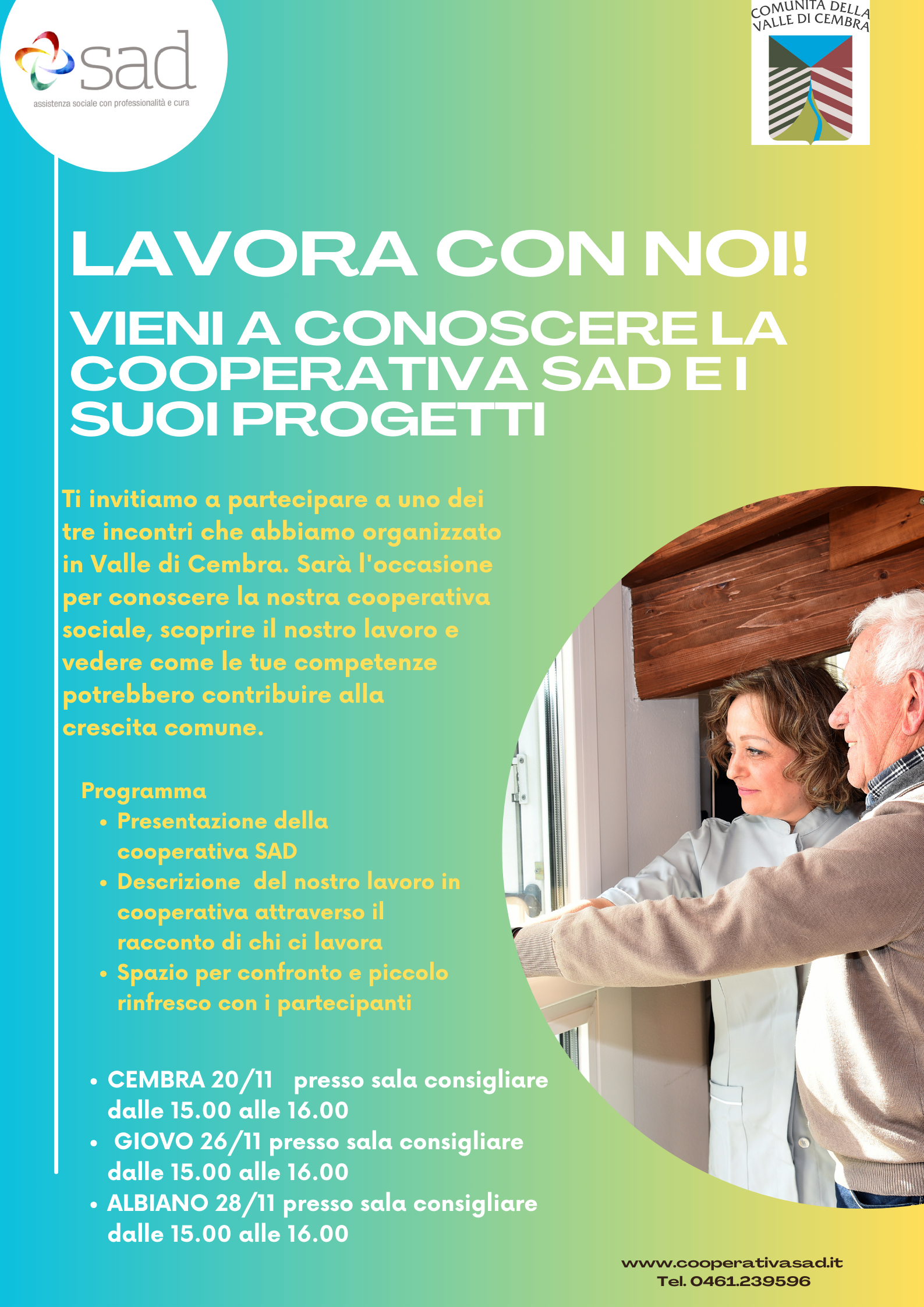 La cooperativa SAD invita la popolazione a partecipare ad uno dei tre incontri che organizzati in Valle di Cembra.